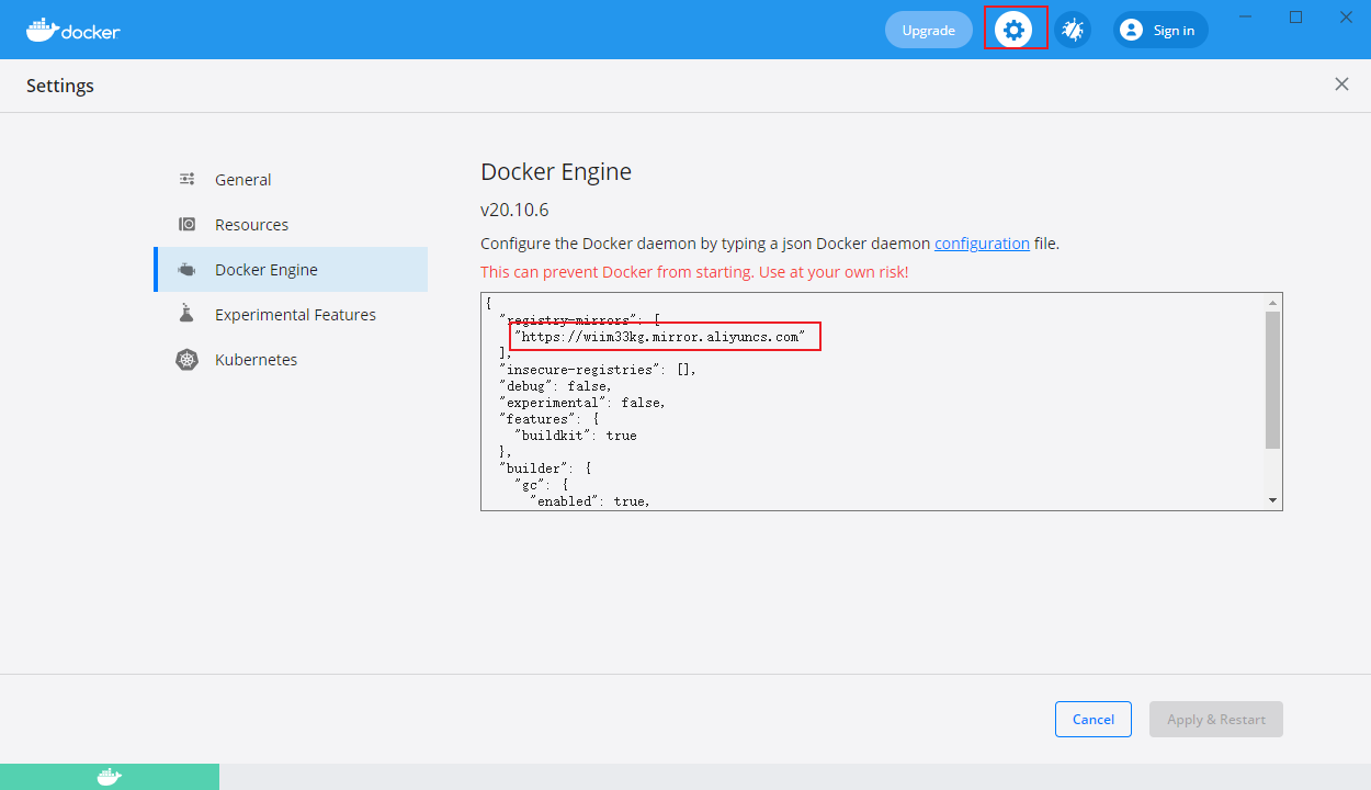 点击 Apply & Restart按钮,等待Docker重启并应用配置的镜像加速器。
