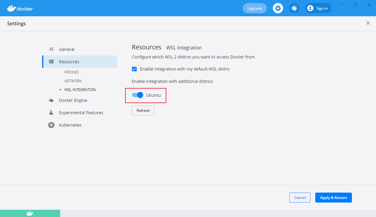 在 Win10 系统下安装好了 Docker,在 Ubuntu 下就不需要安装了,只需要按照如下截图设置下,就可以在 Ubuntu 下使用 Docker 命令。